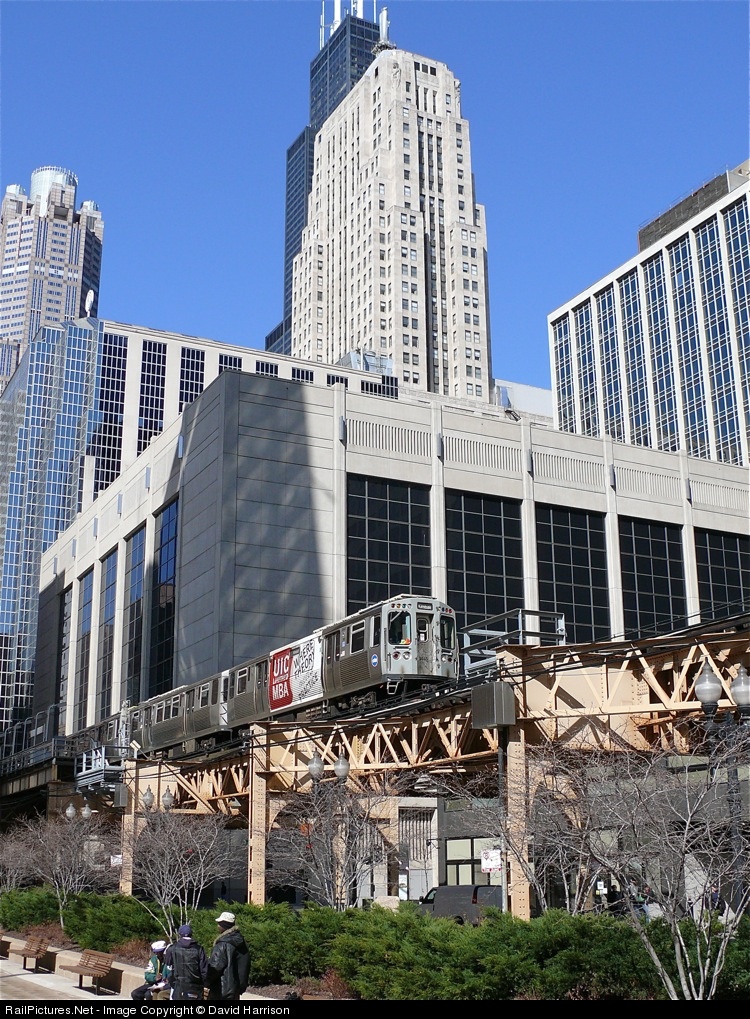 | A NB Brown Line train leaves the skyscrapers of the business district behind as it proceedes over the south leg of the Loop elevated over Van Buren ST. The centered building, long the city's tallest since pre WWII days, the Board of Trade building with the statue of Ceres on top has right behind it from this angle the city's current crown, the Willis...OOPs the Sears Tower shall we say. The Loop "L" is 113 years old and counting. |