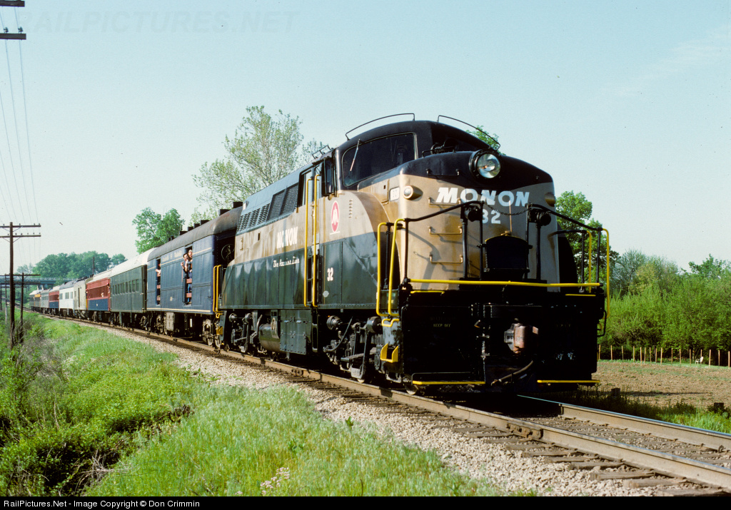 KRM's Monon BL2 #32 performs a run-by on a fantrip northbound on the Monon north of New Albany, IN. The Louisville to Bloomington and return excursion had an unexpected delay at Bedford on the return do to a lube oil problem on #32.