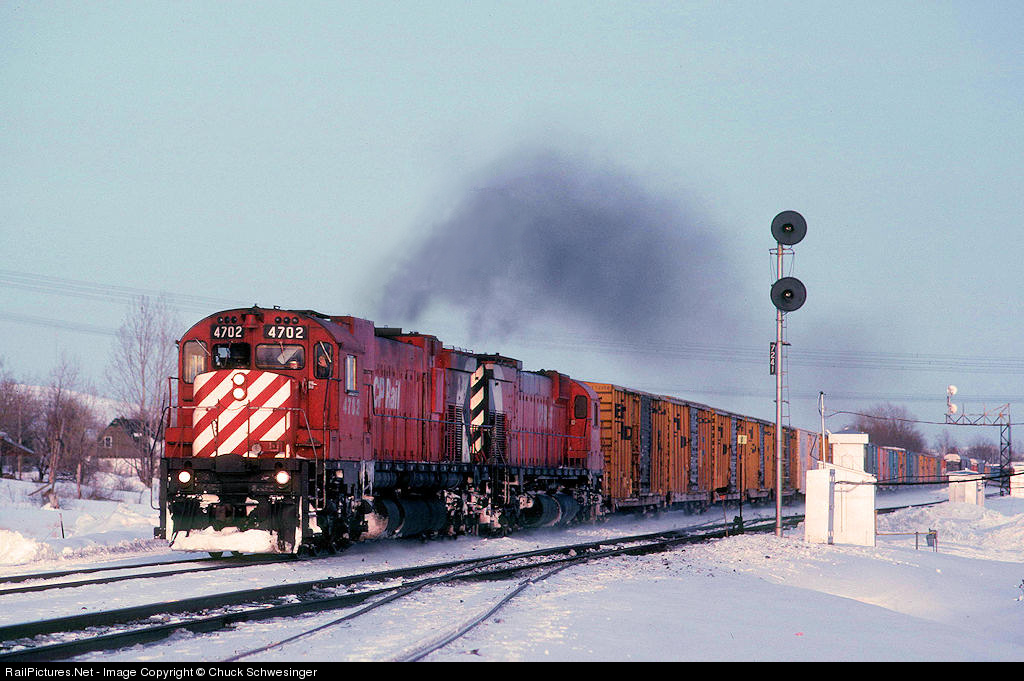 CP 4702,4726 are chugging right along with with a heavy 481 right at sunset on a bitter February day. We had a line up out of Cartier for the area and had covered everything possible but this train, which oddly enough did not have a lead unit listed. As we walked around freezing, we begin to question the wisdom of waiting, especially as the sun quickly began to sink onto the horizon and the 30mph northwest wind seemed to be getting through all of our clothing. Waiting in the truck was out of the question as hearing the train before it arrived was not possible due to the howling wind. In any case we were glad we made the effort as apparently this train had been giving up units since leaving St. Luc due to east-bounds having power trouble in the frigid conditions, leaving this pair of big MLW's to go it alone. This photo was shot by my wife Sonya who definitely drew the attention of the head end crew, giving the big wave.
