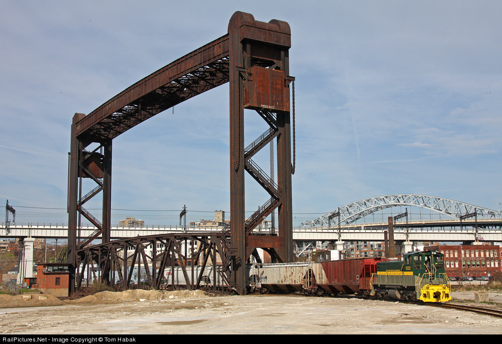 The FIRR Cloggsville turn eases a cut of grain hoppers down the grade and across the Cuyahoga River.