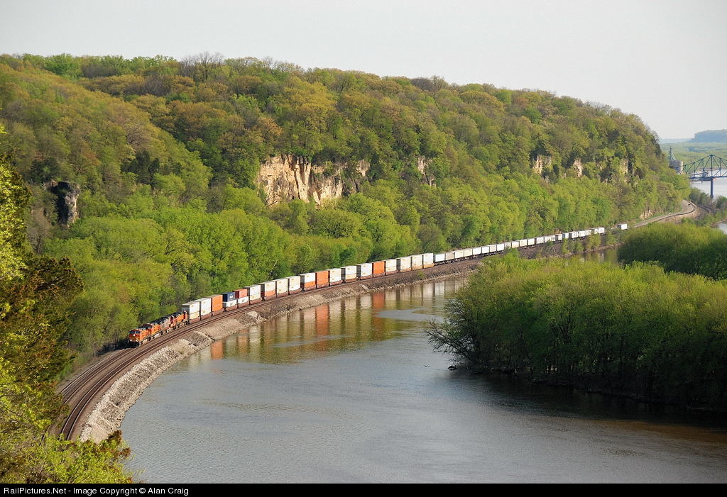 | 'Where nature smiles three hundred miles' - the old slogan Burlington applied to its Mississippi River route to the Twin Cities seems apt to this setting. A BNSF intermodal passes below the Mississippi Palisades on its way to Minneapolis on a glorious spring day.