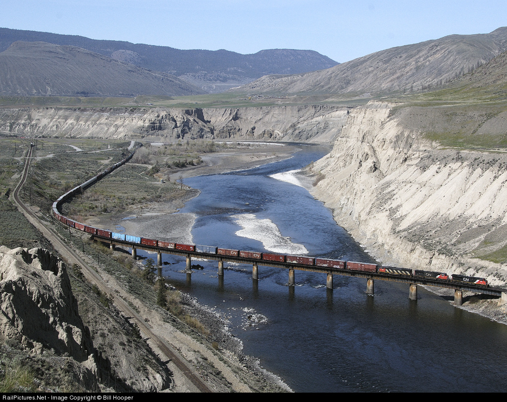 CN eastbound Vancouver to Edmonton intermediate traffic train no. 416 crosses the Thompson River just east of Ashcroft BC. The line to the left is the main line of Canadian Pacific.
