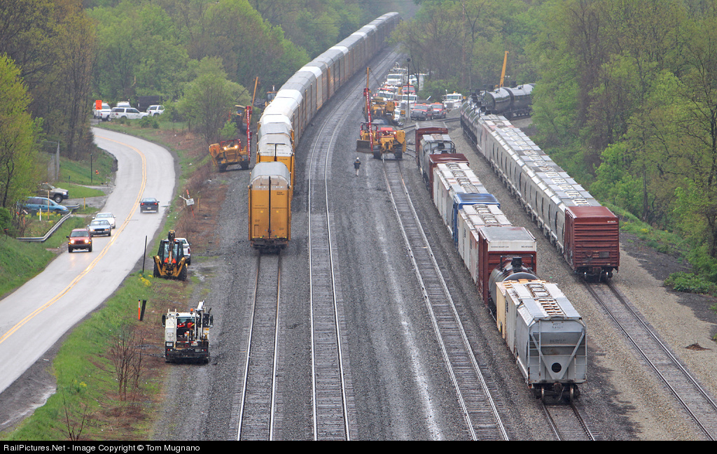 | Crews work in pouring rain to finish the cleanup of a Derailment of 11J early Monday morning at Aprox 04:30 at Radebaugh ( CP Rade ). The tracks on the right are for interchange with the Southwest Pennsylvania Railroad or SWP By the time i took this photo after work at 18:22 the first train thru just cleared the site headed west, So the line is now back open with track 1 back in service |