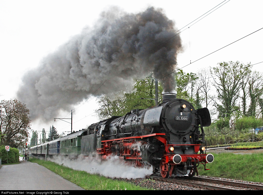 Oilfired three cylinder "Pacific" 01 1066 of "Ulmer Eisenbahnfreunde" (UEF) made a visit in Switzerland with a 10 car train from Stuttgart. On the way back home via Konstanz-Singen she is bringing the train to track speed after a crossing in Uttwil (near Romanshorn).
