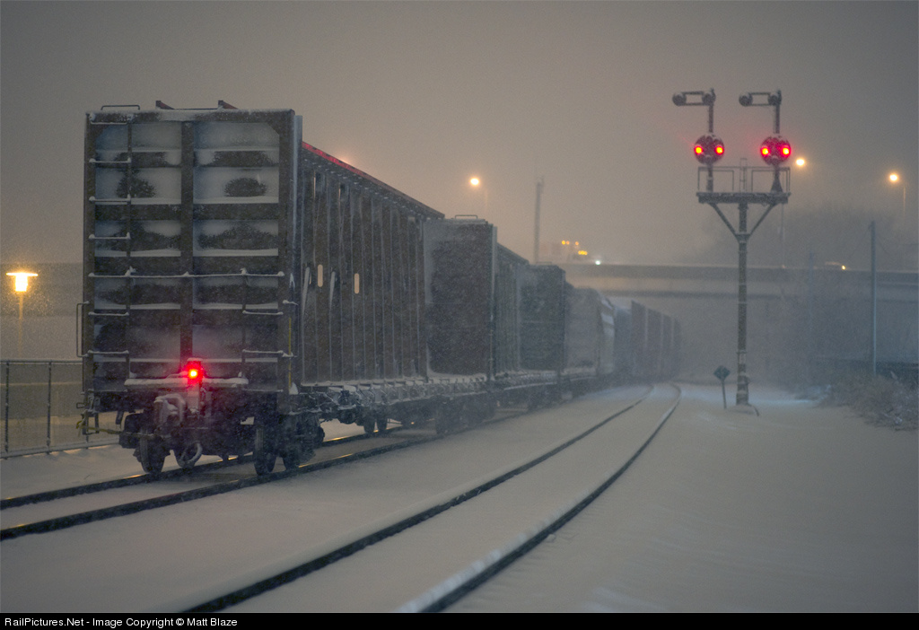 The tail end of a CSX freight train heading north toward the Park Tunnel at midnight, as a severe blizzard begins in Philadelphia.