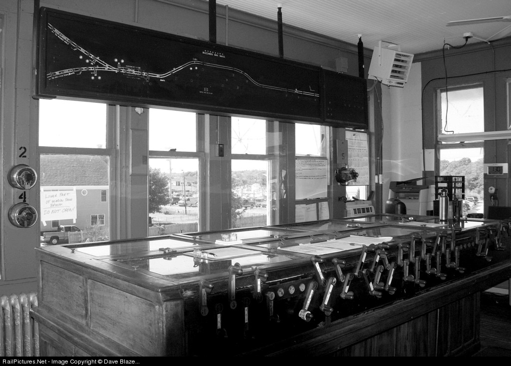 | A view from within the 1911 ex NH interlocking tower U416 featuring the original 1930s era pneumatic US&S interlocking machine that controlled the signals and derails for the bridge as well as the Canal Jct. switch. The CTC board can be seen above the windows with odd hump in the track schematic indicating where a four track passenger yard once stood in front of the depot back in the glory days of the New Haven. At the time of this photo these original controls were still functioning albeit with only three levers remaining in service. A Mass Coastal dispatcher controls train movements from this second floor perch in this classic 98 year old structure. As you read this however, all of that is now history as the interlocking was replaced with solid-state microprocessor controls about two months after this photo was taken. At least the tower will survive and remain manned part time for the foreseeable future. Thanks to Mass Coastal employee Andrew Eldridge for the gracious tour. |