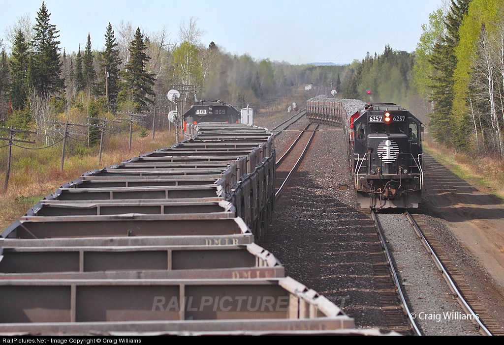 | Each day there is 2 sets of T-Bird trains that haul raw iron ore between Largo and Fairlane for United Taconite. The trains usually leave the opposite ends at the same time which allows for a meet on double track between Fairlane and Wolf. These trains traditionally make 2-4 trips a day and this trip the trains are meeting at Fairlane. As the empty heads out onto main 1, the load is heading into Fairlane off main 2. |