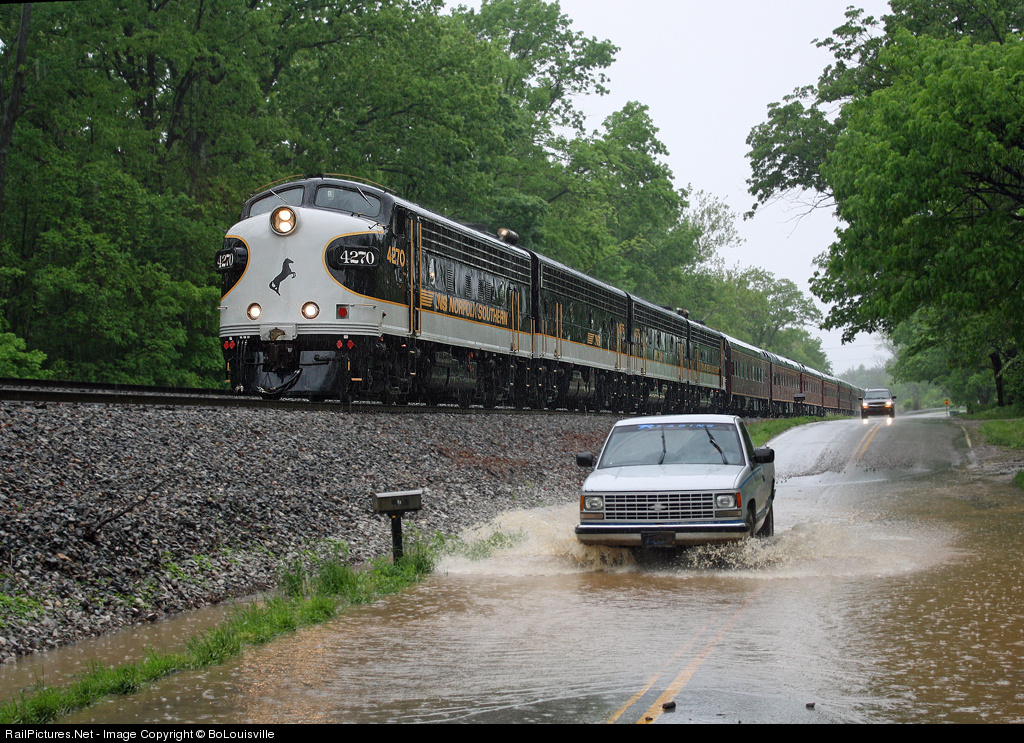 | NS Derby train led by NS 4270 sits on main waiting for a train at Tucker Station Road in Louisville, KY. Flooding water gets on road next to tracks while cars make their way through it. |