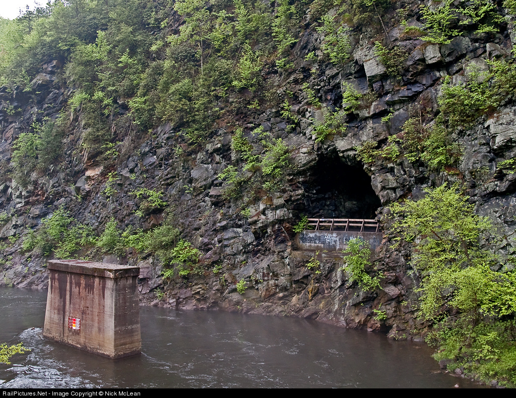 At the entrance to the Lehigh Gorge State Park just outside of Jim Thorpe, one can still see what's left of the impressive original CNJ track alignment from White Haven to Jim Thorpe - amazingly constructed in 1866 and known as the Turn Hole Tunnel. The line carried 2 tracks, but the tunnel was deemed unsafe, so a new line around the edge of the cliff right beside the parallel Lehigh Valley line was opened in 1912. The Turn Hole Tunnel and bridge wasn't abandoned until the 1950s. CLICK HERE for an impressive AB(2) photo from the top of this cliff that shows the 1912 CNJ arrangement (now a service road) and the adjacent LV trackage (now the RBMN). Or CLICK HERE for a view of the bridges from the riverbank.