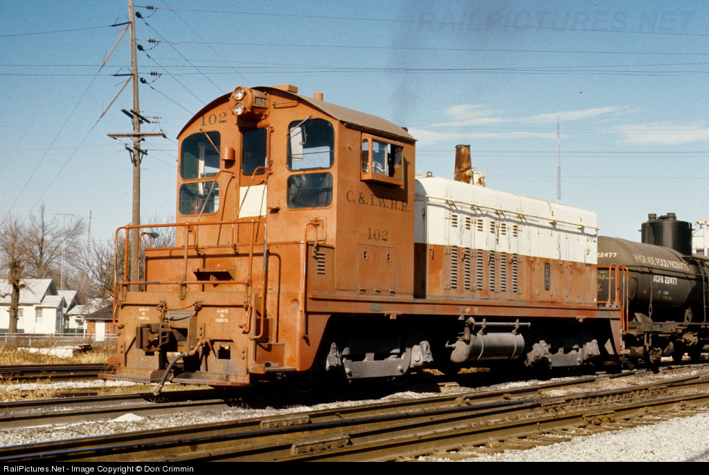 Chicago and Illinois Western SW7 102 works the Ridgely Yard in Springfield, IL. C&IW was a Chicago-area shortline which fell under the control of the Illinois Central. This SW7, identified by only initials and number, but painted in ICG white and orange, worked the Springfield area during 1976 and 1977.