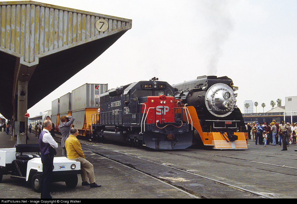 Unusual visitors to Los Angeles Union Station on May 13, 1981 ... Southern Pacific 4-8-4 4449 simmers on the track adjacent to SD40E 7364 and its display of new freight car technology - a 3-unit car designed to hold six shipping containers, stacked one atop the other (most likely SP 513301), and the Glasshopper fiberglass covered hopper built by ACF in conjunction with Cargill and the SP (RNDX 163). The technology of the Glasshopper was not duplicated, but the idea of stacking containers proved to be wildly successful! The 4449 was the power for the train that brought the Glasshopper into Los Angeles.