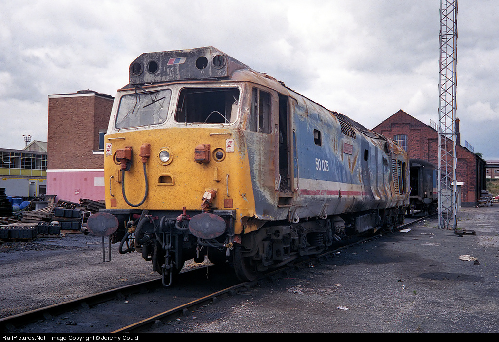 | Whilst in charge of the 21:15 Oxford to Paddington service on the 6th August 1989, 50025 'Invincible' was derailed at high speed at West Ealing by an obstruction deliberately placed on the line. Thankfully, there were no serious injuries. At Old Oak Common, Invicible shows the damage that would eventually lead to withdrawal on the 14th August. Some news footage of the incident can be found at http://www.youtube.com/watch?v=ttxlSVik1wo. |