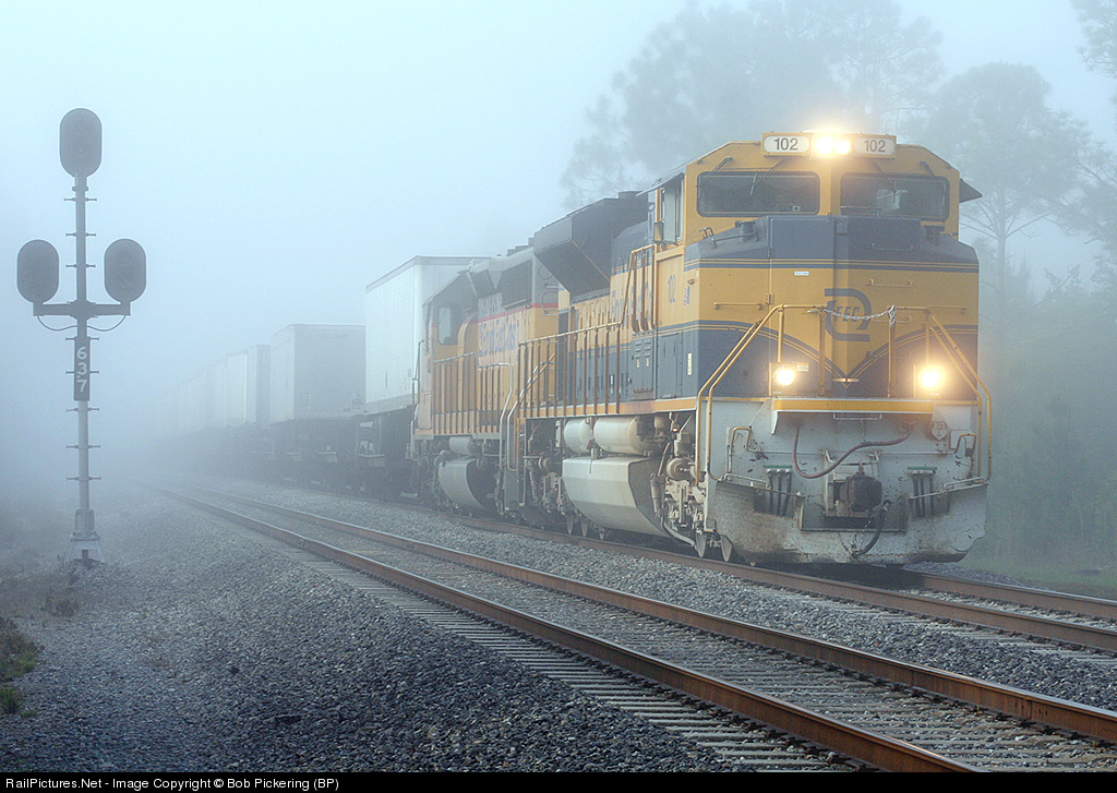 | FEC 226 cuts through the morning fog at Doreana Siding. Today 226 had an SD70M-2 - SD40-2 combo. The FEC is paring up some SD70M-'s with each other, SD40-2's or GP40-2's. Dorena Siding is one of the longer ones on the FEC located just north of Bunnell. |