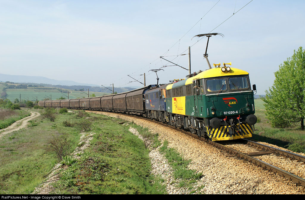 | 87020 and 022 pass Anton with the 09.30 Pirdop - Burgas emptys,87020 sports the new BZK colours whilst 87022 is still in GBRF livery.When both locos were in the hands of vigin trains 020 was named "North Briton" and 022 named "Cock o the North " . |