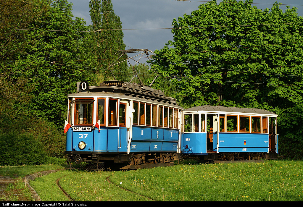 | Historic tram SN1-37 was built in 1912 by Sanocka Fabryka Wagonow and his trailer PN3-555 (by MAN Nürnberg, 1909). |