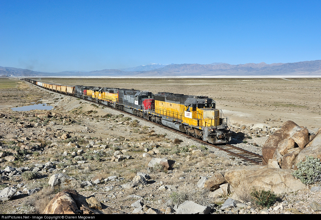 | Five Trona Railway EMDs lug 12 loaded covered hoppers, and a long string of coal empties out of the Searles Valley. In 23 miles the train will reach the summit at Searles where the cars will be interchanged with the Union Pacific Railroad, and inbound cars will be picked up for the return trip to Trona. |
