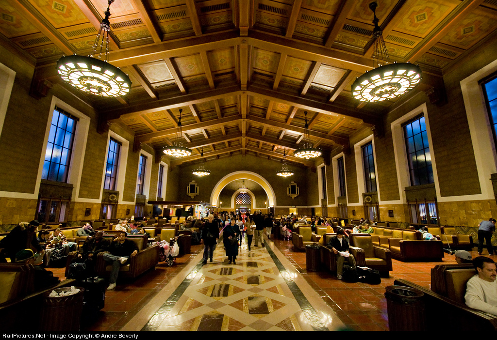 Warm and cozy evening in the Union Station waiting room while rain drizzles down outside.
