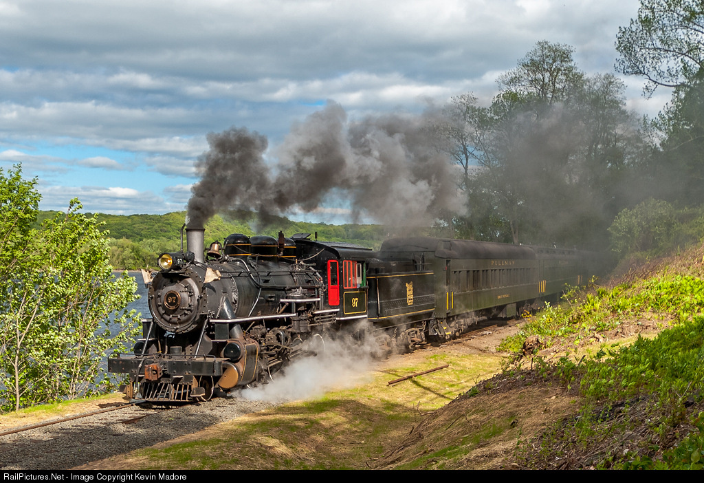 Steam to Goodspeed! Valley Railroad Consolidation #97 drifts along a stretch of track that the railroaders call "Broadway", as she approaches her ultimate destination, Goodspeed Station in Haddam. Those that are familiar with this line know that you don't normally see Valley Steamers running this far north. The regular steam run goes no farther than Chester. Today however, old 97 is hauling a special charter, which took several bus-loads of folks from Haddam down to Deep River for a ride on the line's riverboat, the Becky Thatcher. For most of the day, instability clouds blunted my efforts to get decent pictures of this special trip, but as she ran the last mile of the return trip, the sun suddenly broke through for about 10 seconds, and fortunately, I was there to capitalize!