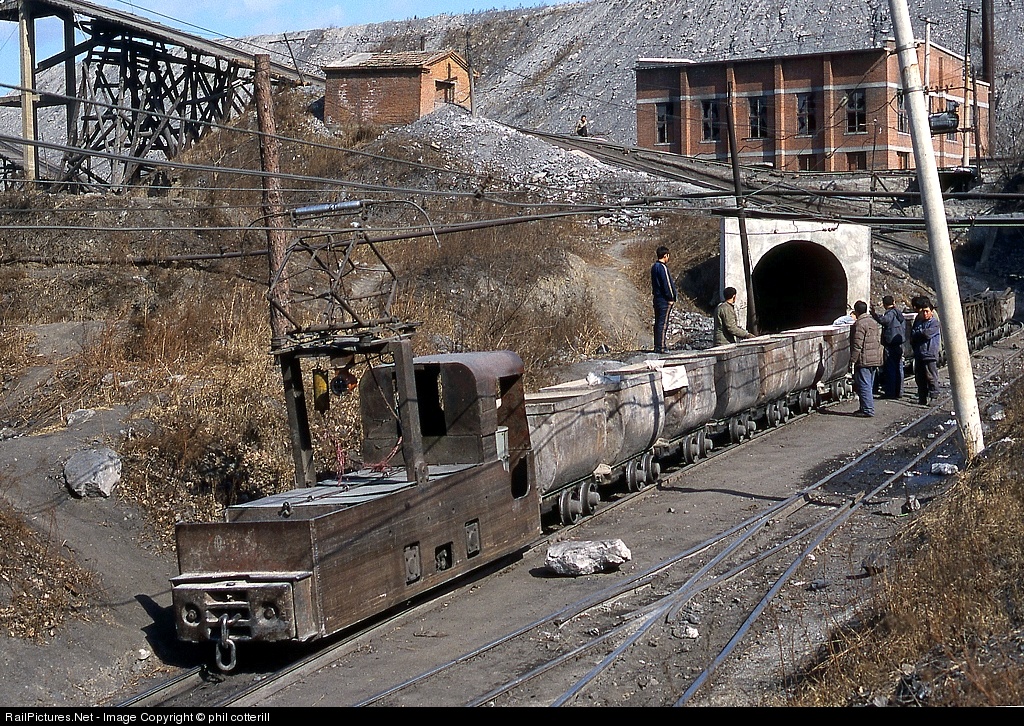| A 4 wheeled electric loco shunts wagons at a mine at Hegang. Many Chinese mines use this type of loco. They are fascinating to watch as the driver (engineer) controls the power by raising and dropping the pantograph by means of a rope from the cab! |