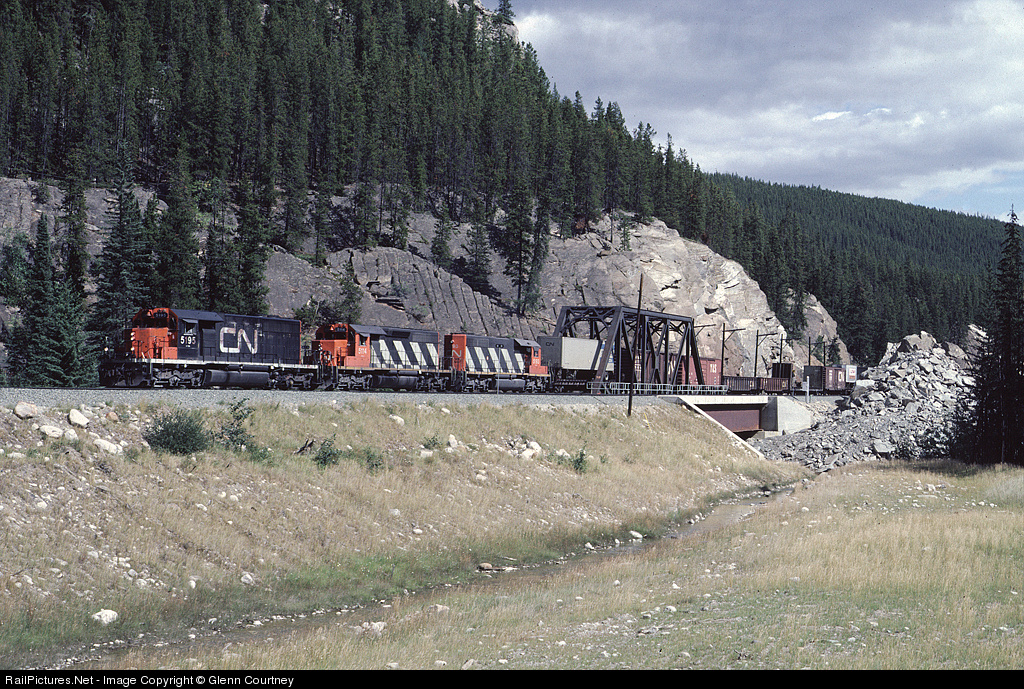 CN 5195 leads a trio of SD40s about eight miles west of Jasper, Alberta.