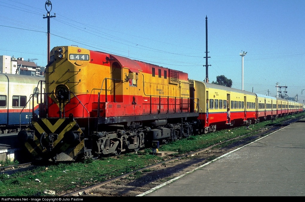 | ALCo. RSD16 #8441 enters Retiro Station with a local passenger train of the San MartÃn Railroad. The last car in the consist does not carry commuters, it is a baggage car bringing safes with money collected from the tickets sold at intermediate stations along the line. |
