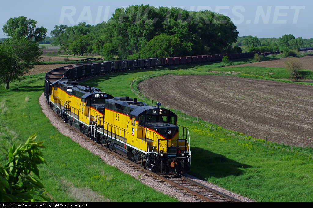Dakota & Iowa's northbound Ethanol local has just crossed the Big Sioux River which marks the border between South Dakota and Iowa. A rare sight this day is three of the road's small GPs: two GP9s trailed by a GP20. All three are former BN locomotives. For the past few years the small GPs have been relegated to yard service at Dell Rapids, Hawarden, and Sioux City.