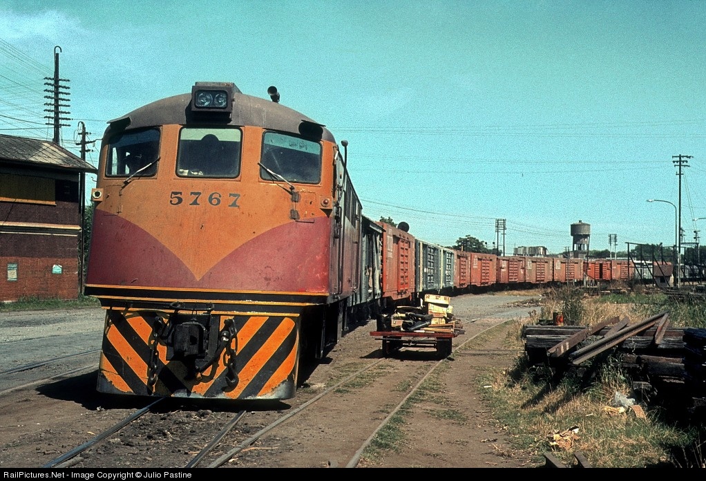 General Belgrano Railroad's meter-gauge General Electric 75t. #5767 makes a rare appearance heading through-freight train number 5004, as it enters Saldias Yard in Buenos Aires. Being the premier freight train of the line, General Belgrano RR. always allocated his biggest and newest power to the daily runs from Guemes, in the northern Province of Salta, to Saldias in Buenos Aires. But in this day the old order has taken the place of the newer diesels. Number 5767, originally equipped with a 910HP Cooper-Bessemer diesel engine, was built by GE in 1950.