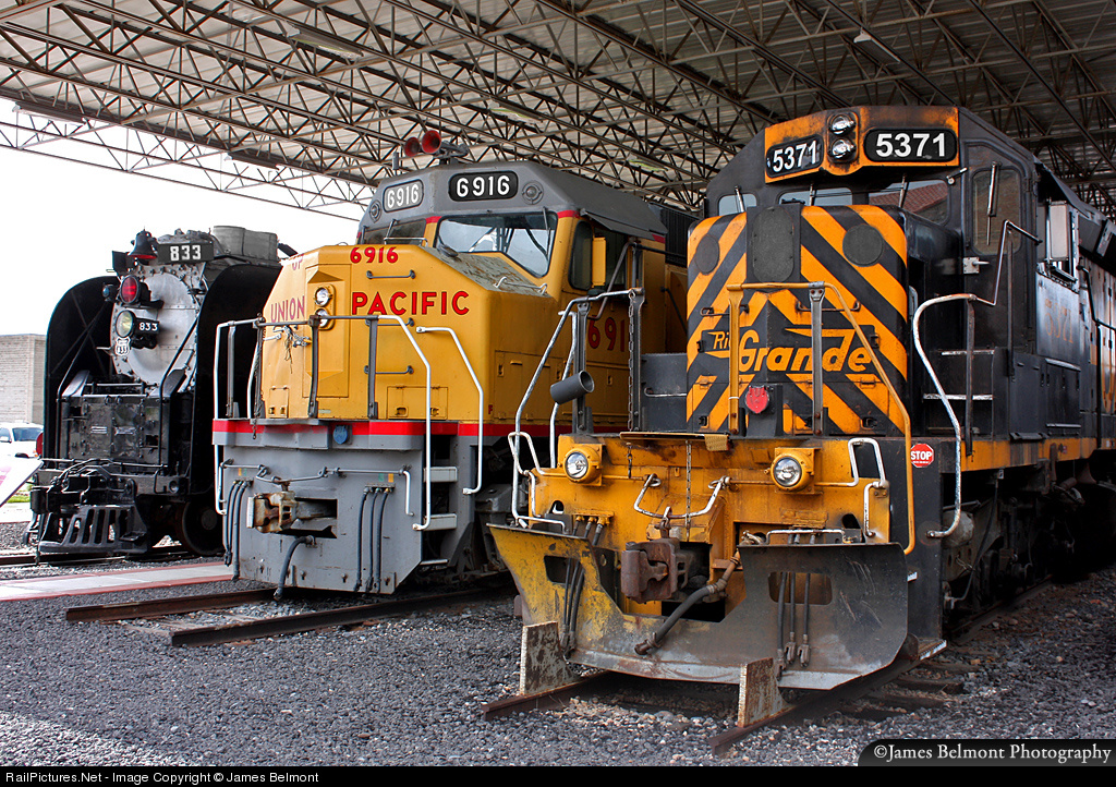 | A fine trio of locomotives span the generations at the Utah State Railroad Museum. Union Pacific 4-8-4 #833 (an FEF-2) was built by American Locomotive Company in 1939, UP 6916, (a DDA40X) was built by EMD in 1969 and D&RGW 5371 (an SD40T-2) was built by EMD in Aug. 1975. |