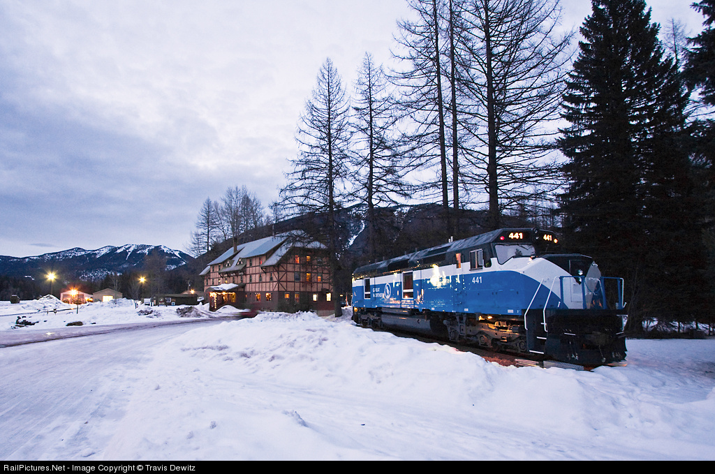 | 24. This will eventually be where I lay my head for the night. Yep, the hotel in the back ground, The Isaak Walton Inn. My pockets weren't deep enough for the Great Northern Suite and my one night stay wouldn't have qualified if they were. From the outside they did a great job on GN 441. After this photo I went to the Isaak Walton Inn's restaurant for some food which is in the lower left corner of the inn. My room was trackside which is on the left and was in the middle on the 2nd floor. I wouldn't see that room until sometime in the early am and would leave it again well before sunrise. |