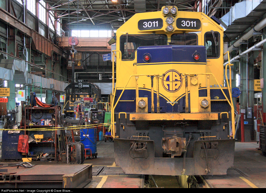 | A peak inside the ARR's heavy repair back shop on a Saturday afternoon finds two 1976 vintage bought new GP40-2s in for some upgrades. The 3011 wears the ARR's current scheme wile the 3006 peaking through in the background wears her as delivered colors from the days of federal ownership. The ARR's well equipped facilities and talented labor force are largely self sufficient and do a remarkable job keeping the railroad's fleet out on the road serving the great State of Alaska. |