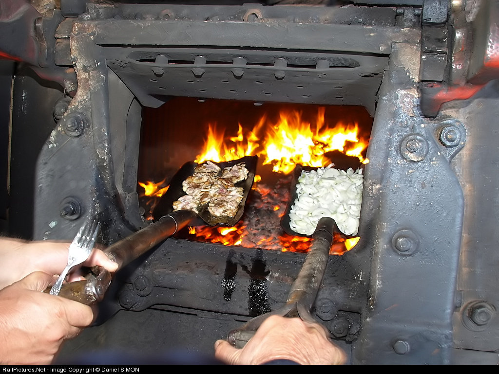 | It's barbecue time on the footplate of the TCDD 56 548. Chicken steaks and onions are being roasted in the firebox of the locomotive. I must admit that the sandwich tasted very good together with a glass of Turkish red wine. |