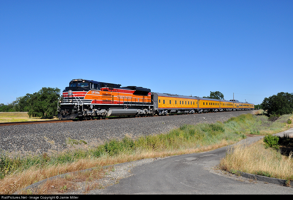 UP 1996 North heads for the Pacific Northwest with a business train in the Sacramento Valley of California.