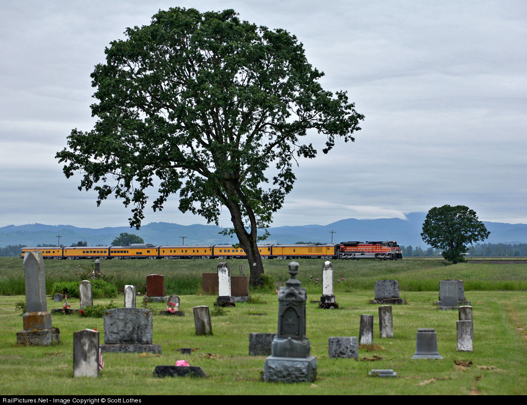 Union Pacific's Southern Pacific heritage unit, SD70ACe no. 1996, leading a six-car business train north in Oregon's Willamette Valley. The train is passing the IOOF cemetery near Harrisburg, where some of the valley's earliest settlers are buried.