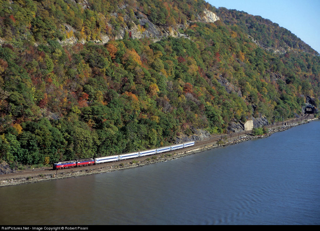 As seen from the Bear Mountain Bridge, a pair of FL9s shove an afternoon commuter train south along the Hudson River on a clear fall day.
