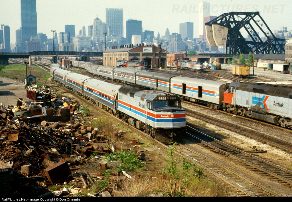 Amtrak F40 228, from the first order of F40s, departs Chicago with afternoon Detroit train 354. In the background, inbound Train 49 backs into 14th Street yard after a trip around the wye.