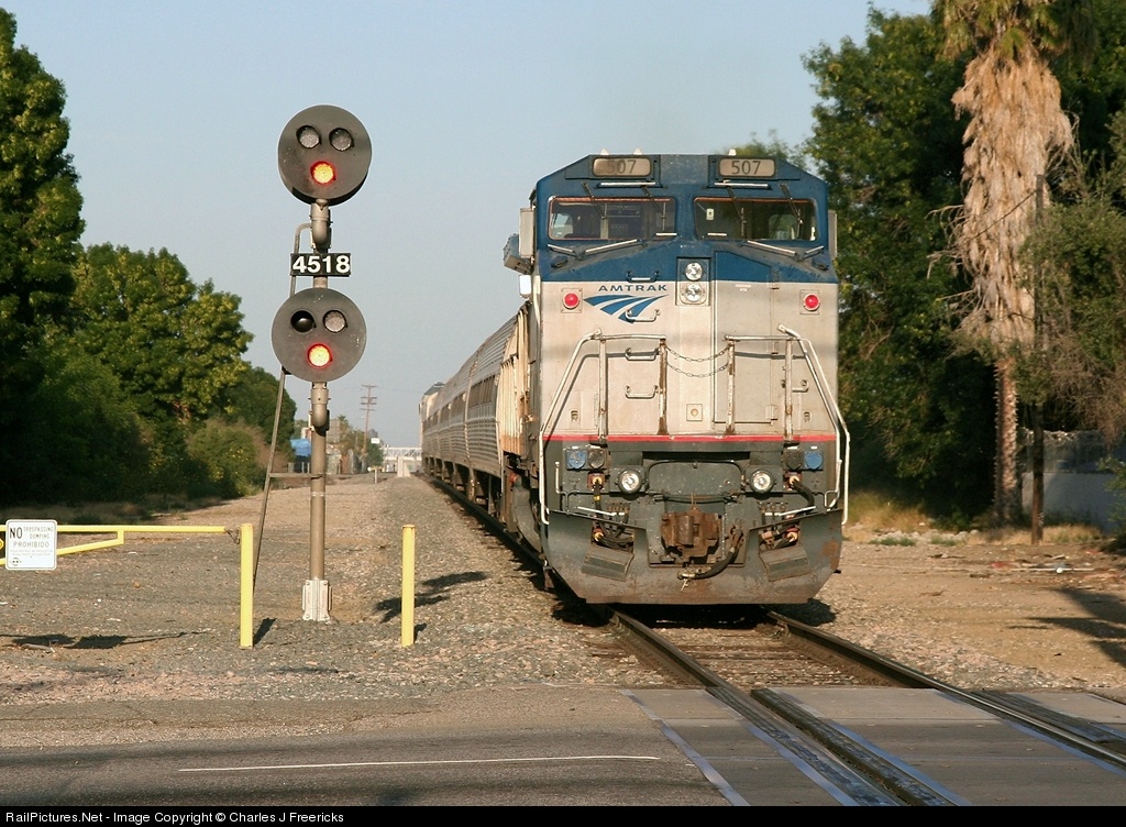 | Running about 15 minutes late, the San Luis Obispo to Los Angeles Pacific Surfliner races through Lake Balboa on the former Southern Pacific Coast Line (today's Metrolink Ventura Sub) and past an aging target signal. This train is the last hold-out of Amfleet and Horizon Fleet cars in California. Usual consist has a Cabbage Car (former F40PH #90208) on one end and a P42 on the other, but as seen here, Dash 8s are frequent substitutes. |