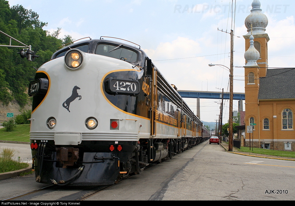 NS OCS 975 with all Four F's, and Ten Cars are seen touring the old MGA/MRY...Mon Line. This was the very first time that the NS F unit's, and OCS have been through the whole length of the Street trackage at West Brownsville, The train went as far as Waynesburg,Pa.
