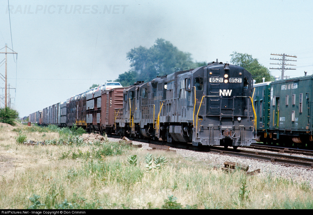 | A westbound N&W freight rolls out of Decatur towards Taylorville, IL, led by U30B 8521 and a pair of older Geeps.