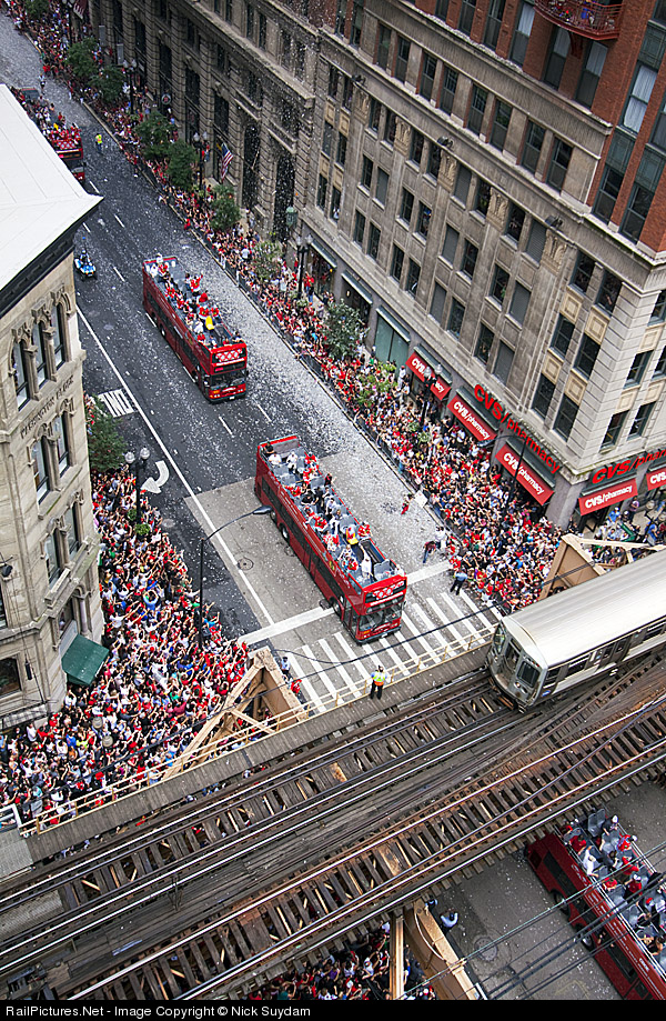 Celebrating the Chicago Blackhawks first Stanley Cup win since 1961, a ticker-tape parade makes its way down Washington St. in Chicago's Loop. The huge crowd goes crazy as the buses carrying the players and the Stanley Cup itself pass by, and overhead, a CTA Brown Line train is just coming in to Washington and Wells.