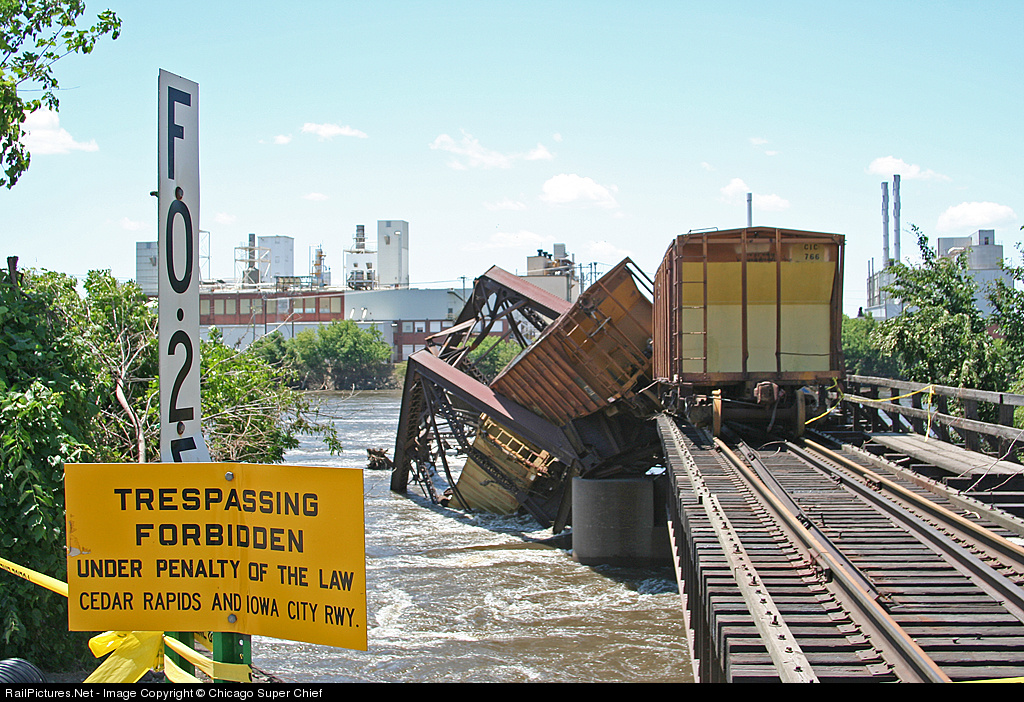 Two years ago today (June 12th), the swollen Cedar River took down CRANDIC's downtown bridge> and several of their hopper cars. Here, ten days later, the river is still high, and the damage is more apparent, and Cedar Rapids begins to clean itself up.