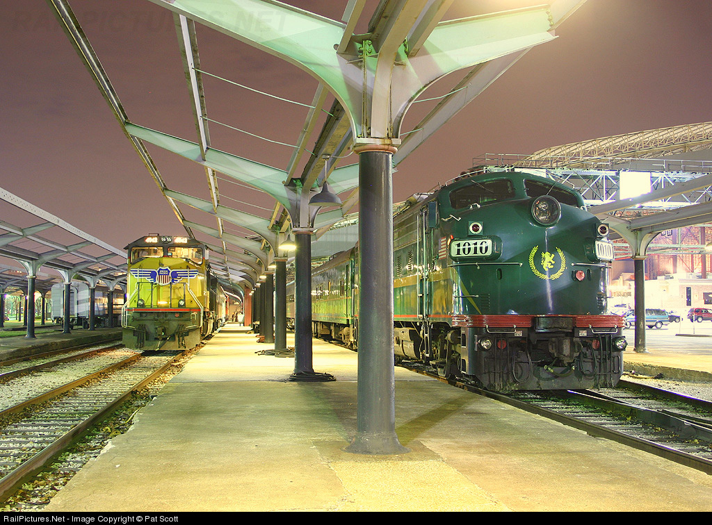 Union Pacific train STXSL 30 sits next to RailCruise America's green train at Saint Louis Union Station.