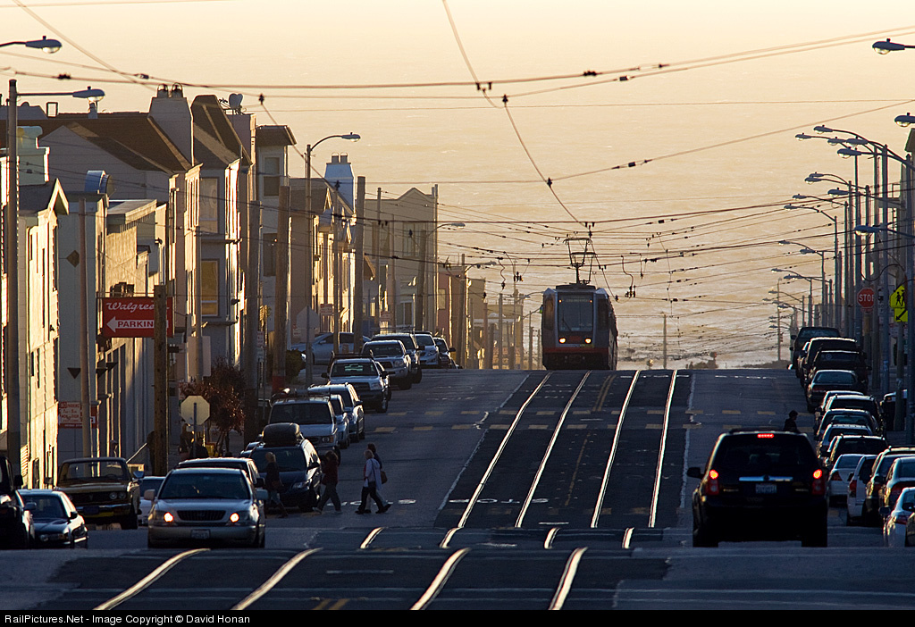 During a quiet moment on the Saturday of Memorial Day weekend, an inbound train on the L Taraval line climbs away from the Pacific Ocean as the sun dips toward the horizon. The classic hills of San Francisco are evident as the tracks follow every contour of Taraval Street.