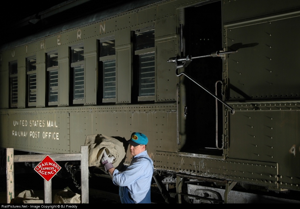 Mail for Barber Jct is being unloaded from the RPO car while train 14 sits in the station.