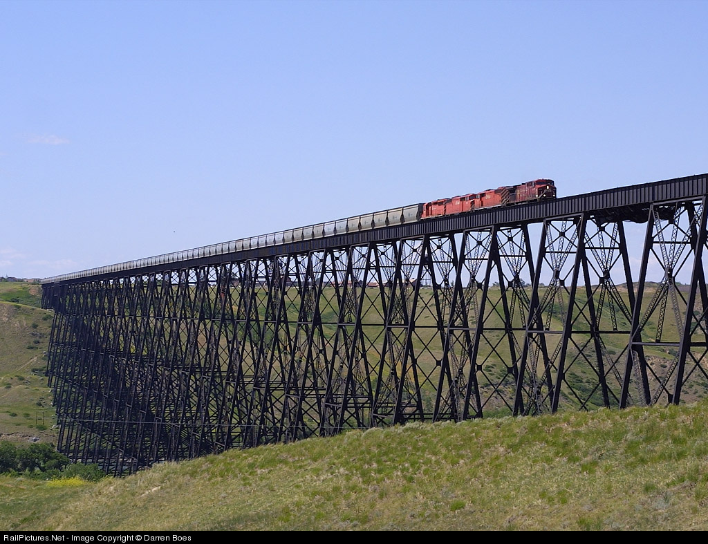 | A year to the day after moving to the Lethbridge area, I finally got a train on the High Level bridge...CP 9618 leads a pair of Red Barns and a standard SD40-2 on 124 potash empties for Saskatchewan |