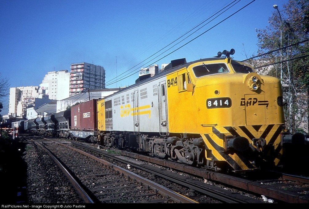 ALCo.-MLW model FPD7 #8414 passes Ministro Carranza station with a freight train of private operator Buenos Aires al Pacífico S.A. (BAP). The locomotive, purchased to ALCo. by Ferrocarriles Argentinos in the first half of 1957 and built by Montreal Locomotive Works under ALCo.'s Specification DL500C with model 251B engines, is a member of the group of 25 units of the only order built under that specification by the Canadian subsidiary. MLW's only other DL500 was demonstrator number 1953E, with a model 244 diesel engine.