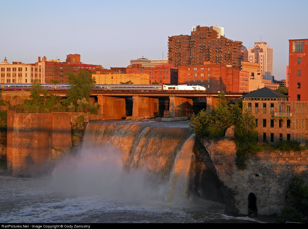 In the last light of day, Empire Service train 283 departs the bustling city of Rochester, passing over the famous High Falls.