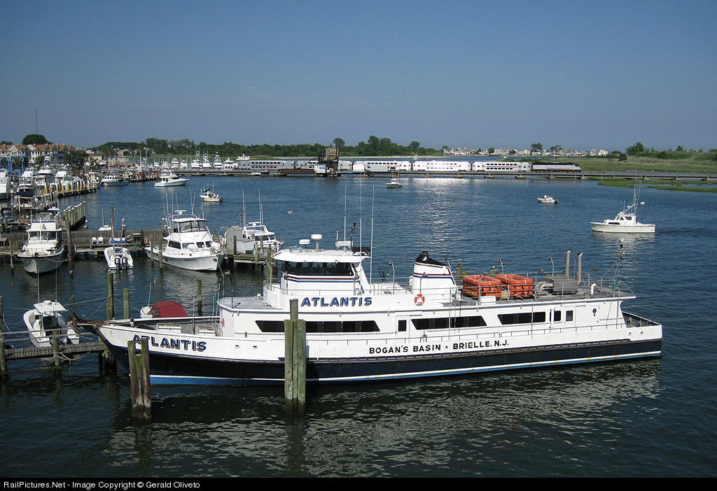 | Train 2303 from Hoboken glistens in the late afternoon sun as it crosses the bridge from Brielle to Point Pleasant Beach. Marine traffic sits still in the Manasquan River, awaiting the bridge's re-opening after the train has passed. |
