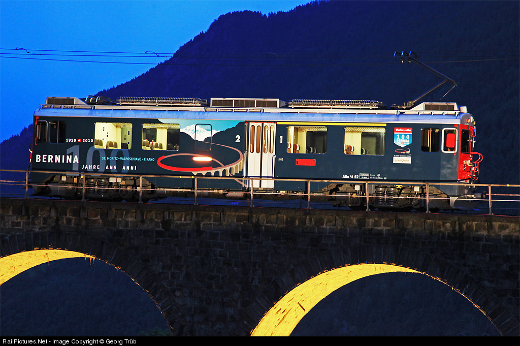 Railcar ABe 4/4 52 promoting 100 years of the Bernina line on the 7.0 grade of Brusio spiral viaduct during the anniversary celebration in Valposchiavo.