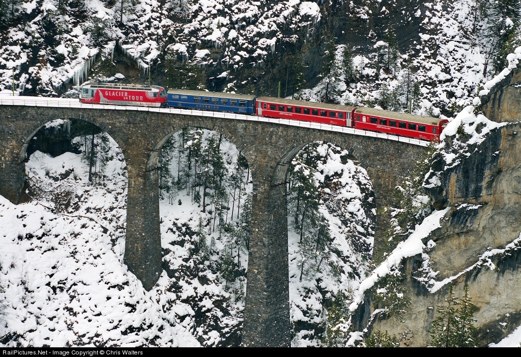 RhB Ge 4/4 III electric locomotive 651 brings a St Moritz to Chur passenger train across the Landwasser Viaduct, just north of Filisur.