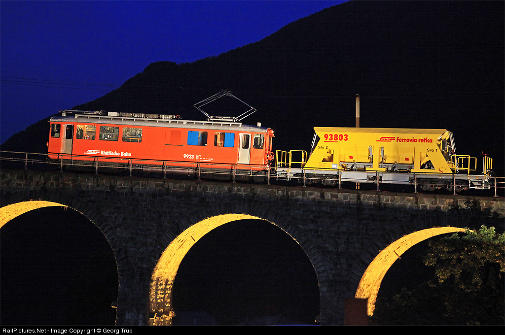 Railcar Xe 4/4 9923 was built more then 100 years ago as BCe 4/4 12 for the Bernina Railway. Today it is used to clear derailments and breakdowns from Poschiavo depot. The brand new ballast car Xac-t 93803 was built in spring 2010.